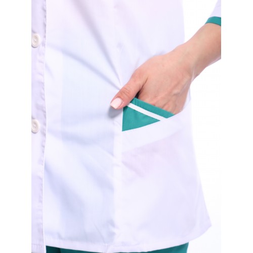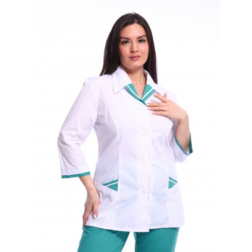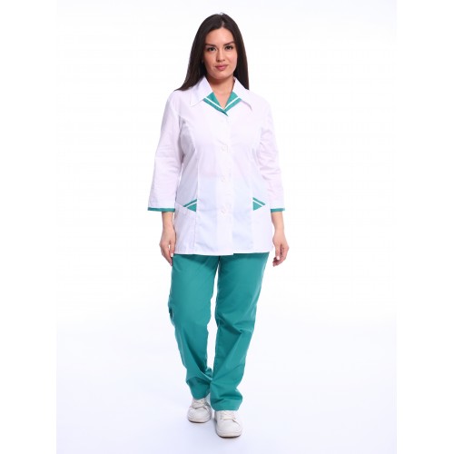 Костюм женский медицинский с длиной рукава 3/4. На спинке - рельефы из проймы. На уровне талии между рельефами - фигурный хляст. Отделка горловины, карманов и рукавов тканью в цвет брюк. Брюки прямого силуэта с поясом на резинке. Мягкая резинка в брюках и широкие рукава блузы подарят свободу движения и комфорт.
